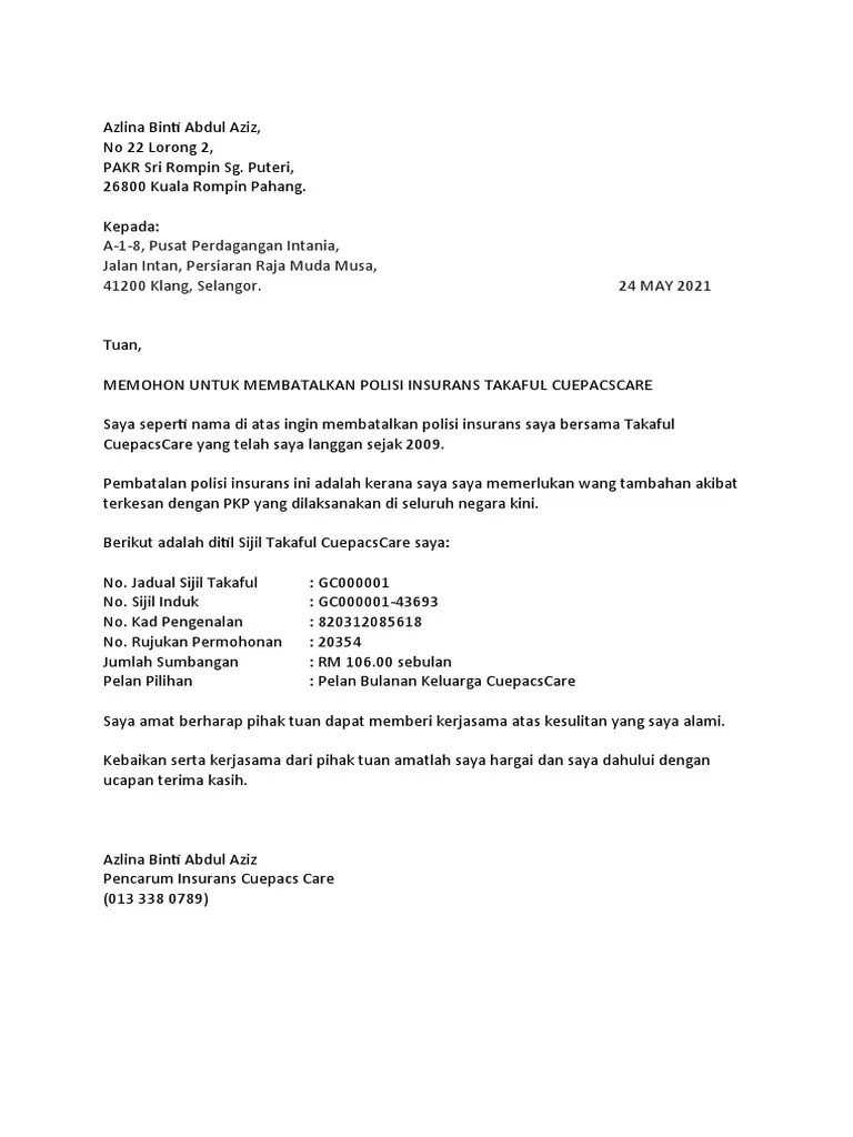 Siti nurain binti mat zin1079,pkt 4, taman gemilang,bandar ceneh baru, 24000 kemaman,terengganu. Berikut kami kongsikan contoh surat pembatalan polisi insurans yang boleh anda ambil sebagai rujukan. This document was uploaded by user . Polisi insurans atau perlindungan takaful yang telah. Download & view contoh surat pembatalan polisi insurans as pdf for free. Download contoh surat pembatalan polisi insurans. Text of surat pembatalan polisi insurans.